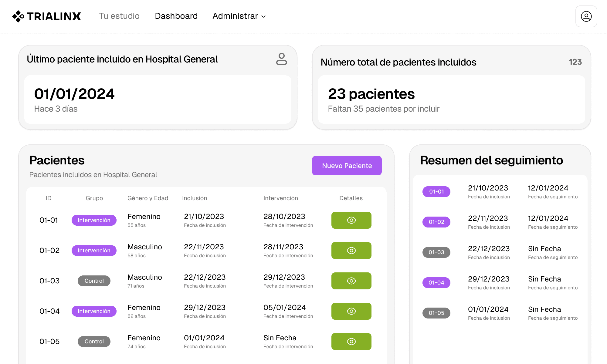 Prueba ahora lo que Trialinx te puede ofrecer, desde la creación y administración de usuarios, la creación de pacientes, aleatorización en diferentes grupos...